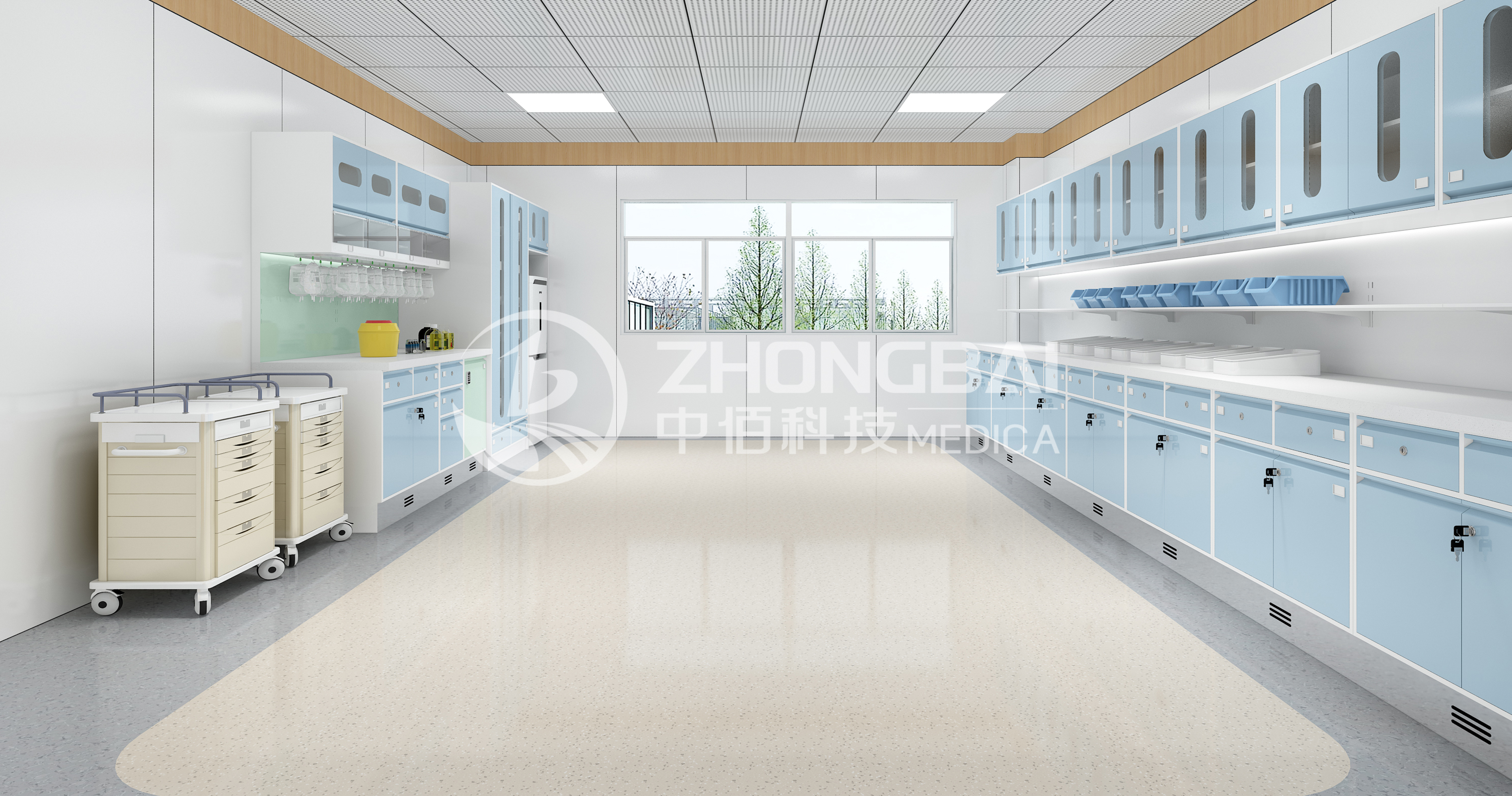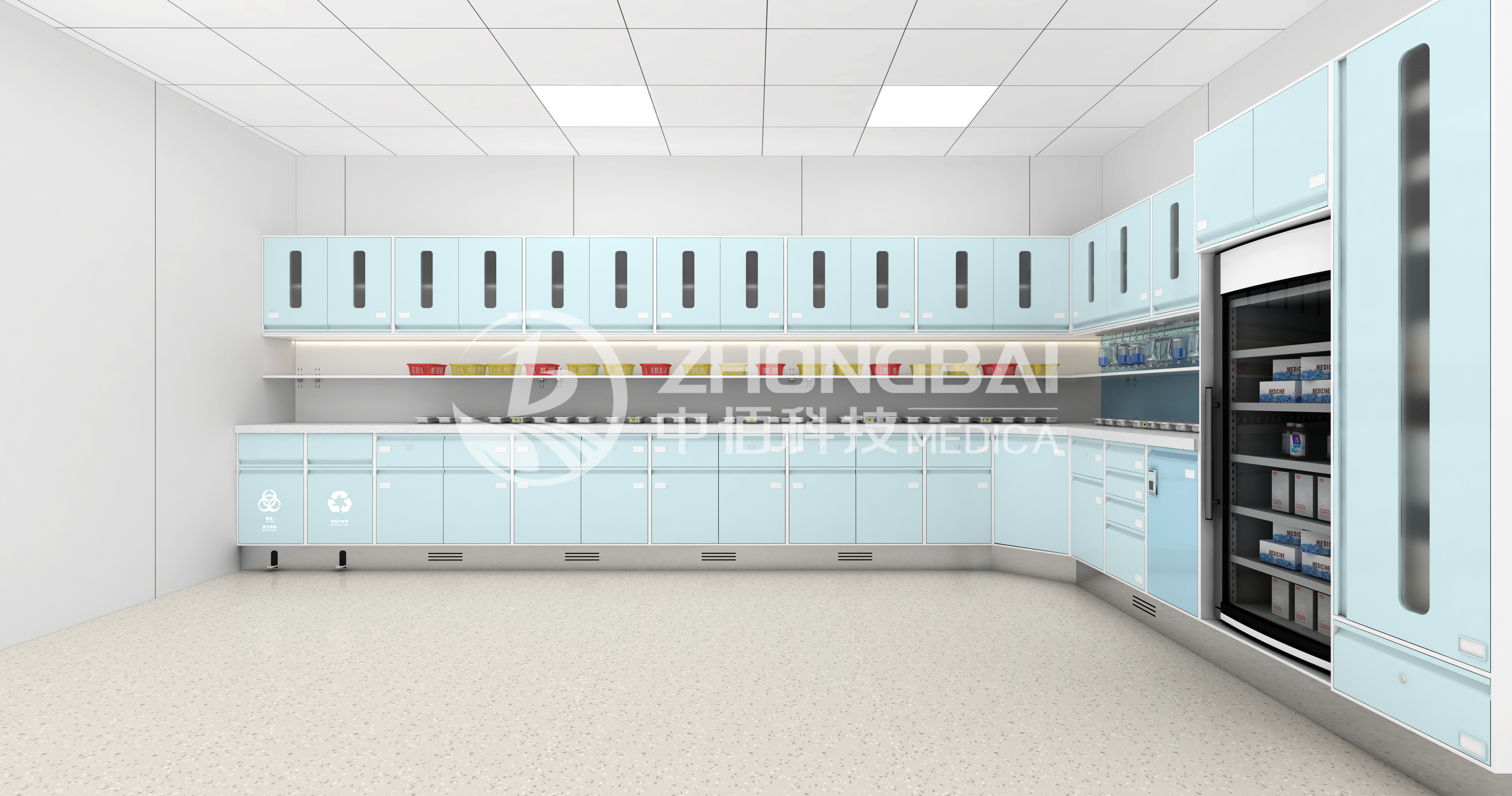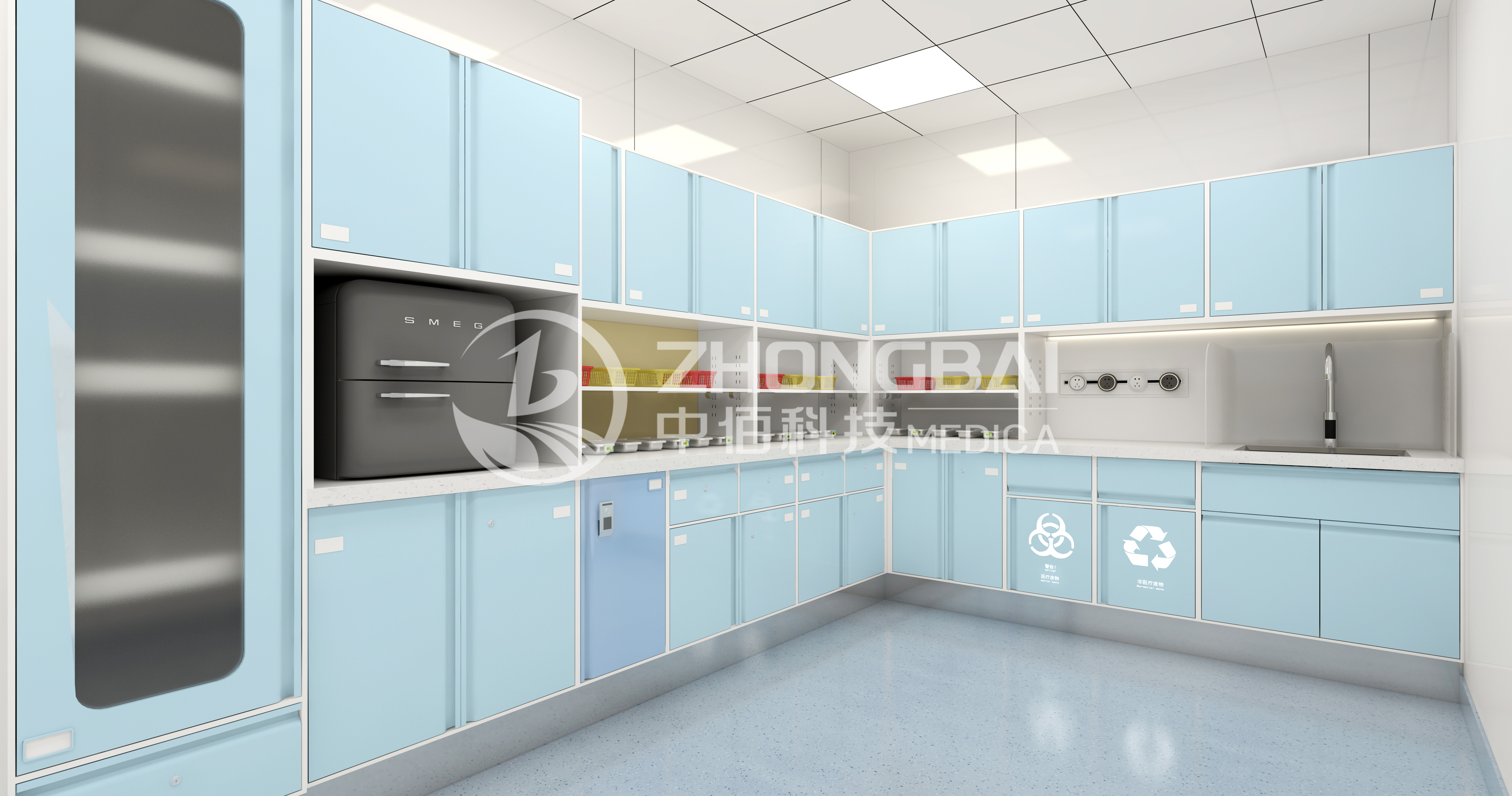治療室設(shè)在護士工作站附近,主要為醫(yī)護人員進行治療準備、藥液配置的專用工作室。室內(nèi)設(shè)有專用操作臺,壁柜、藥柜、發(fā)藥車等,室內(nèi)需潔污分區(qū)管理。